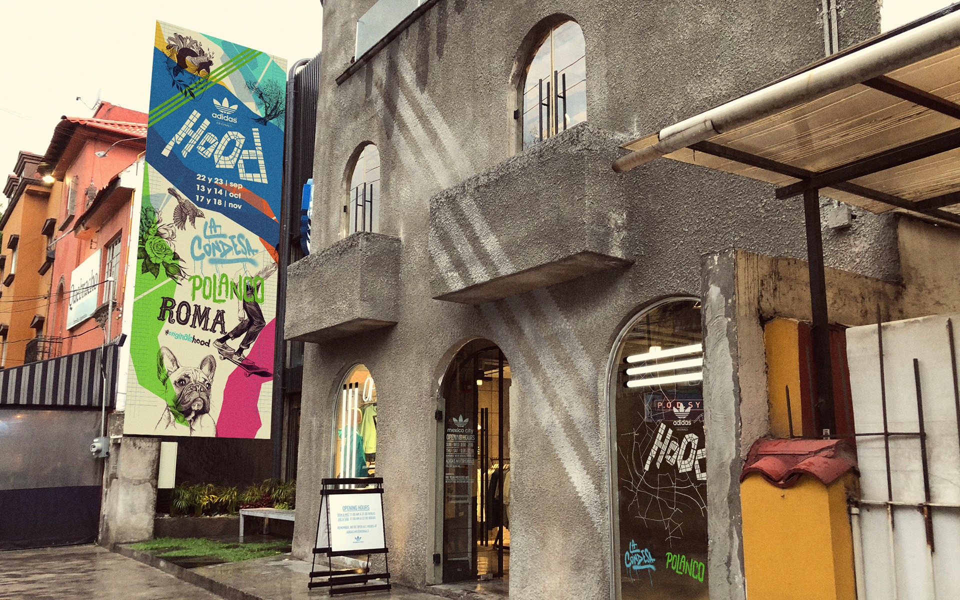 Adidas Originals Hood é um conceito criado para reforçar e valorizar a cultura local e o estilo de vida de bairros icônicos da Cidade do México, promovendo a conexão dessas comunidades por meio de passion points, como arte, música, gastronomia, arquitetura, moda e cultura, que transmitem a essência desses lugares.